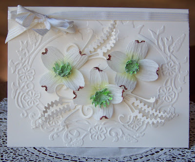 This is gorgeous!! The embossing is so pretty and the flowers are fabulous!! Love the touch of green against the white!! Have a great evening :)